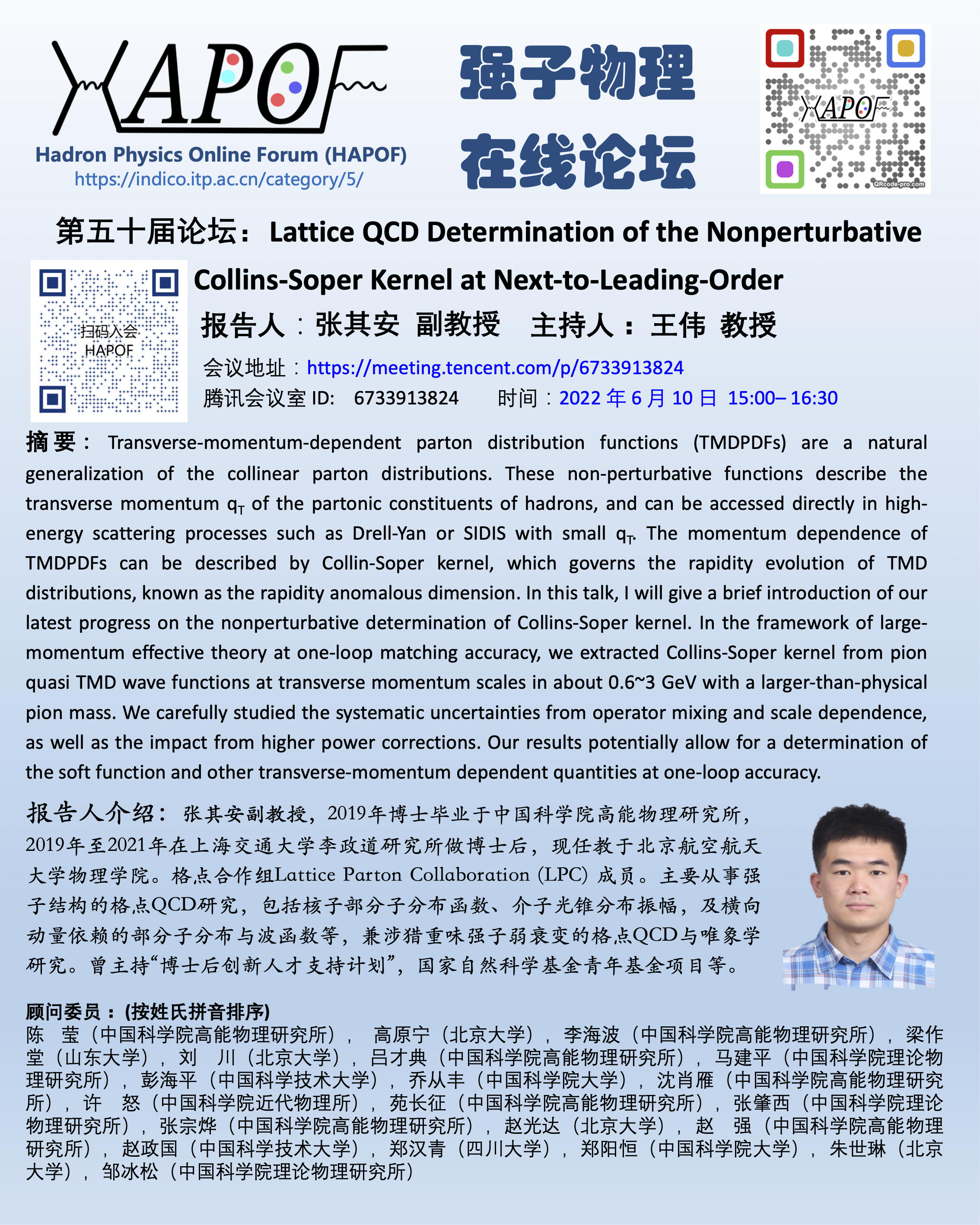 第五十届HAPOF论坛,: Lattice QCD Determination of the Nonperturbative Collins-Soper Kernel at Next-to-Leading-Order,张其安 副教授,2022 年6月10日