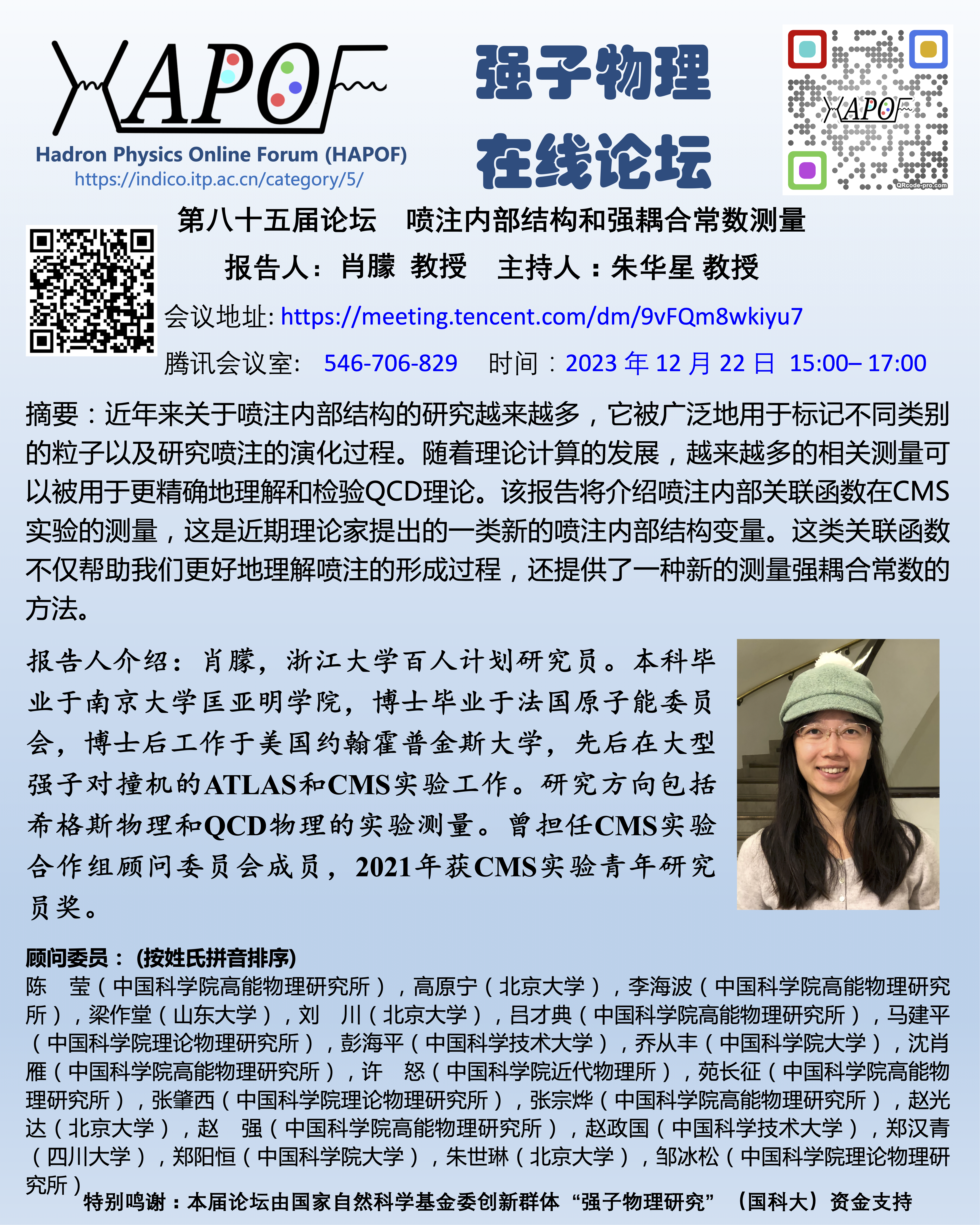 第八十五期HAPOF论坛,喷注内部结构和强耦合常数测量,肖朦 教授,2023年12月22日