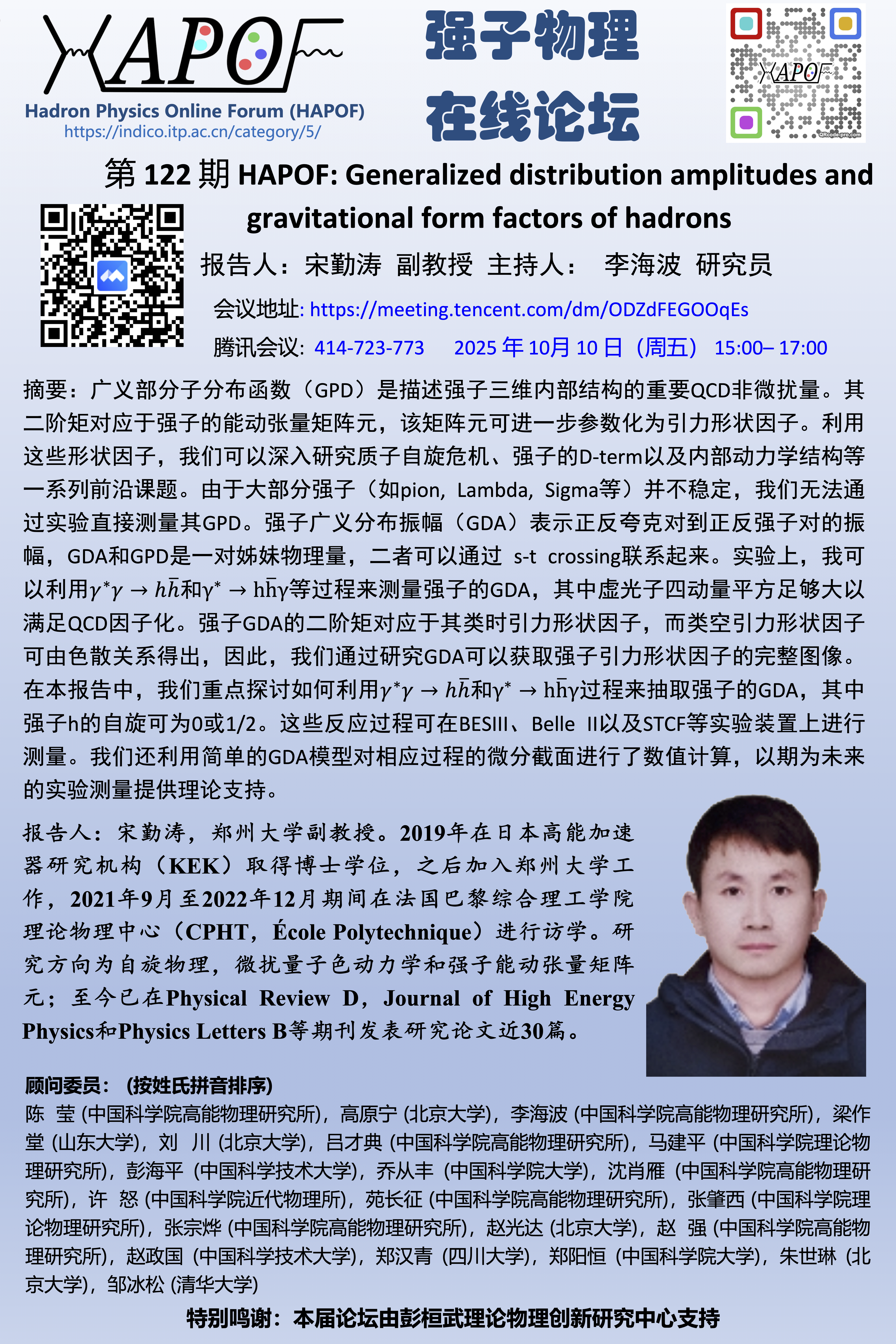 第一百二十二期 HAPOF,Generalized distribution amplitudes and gravitational form factors of hadrons,宋勤涛 副教授,2025年10月10日