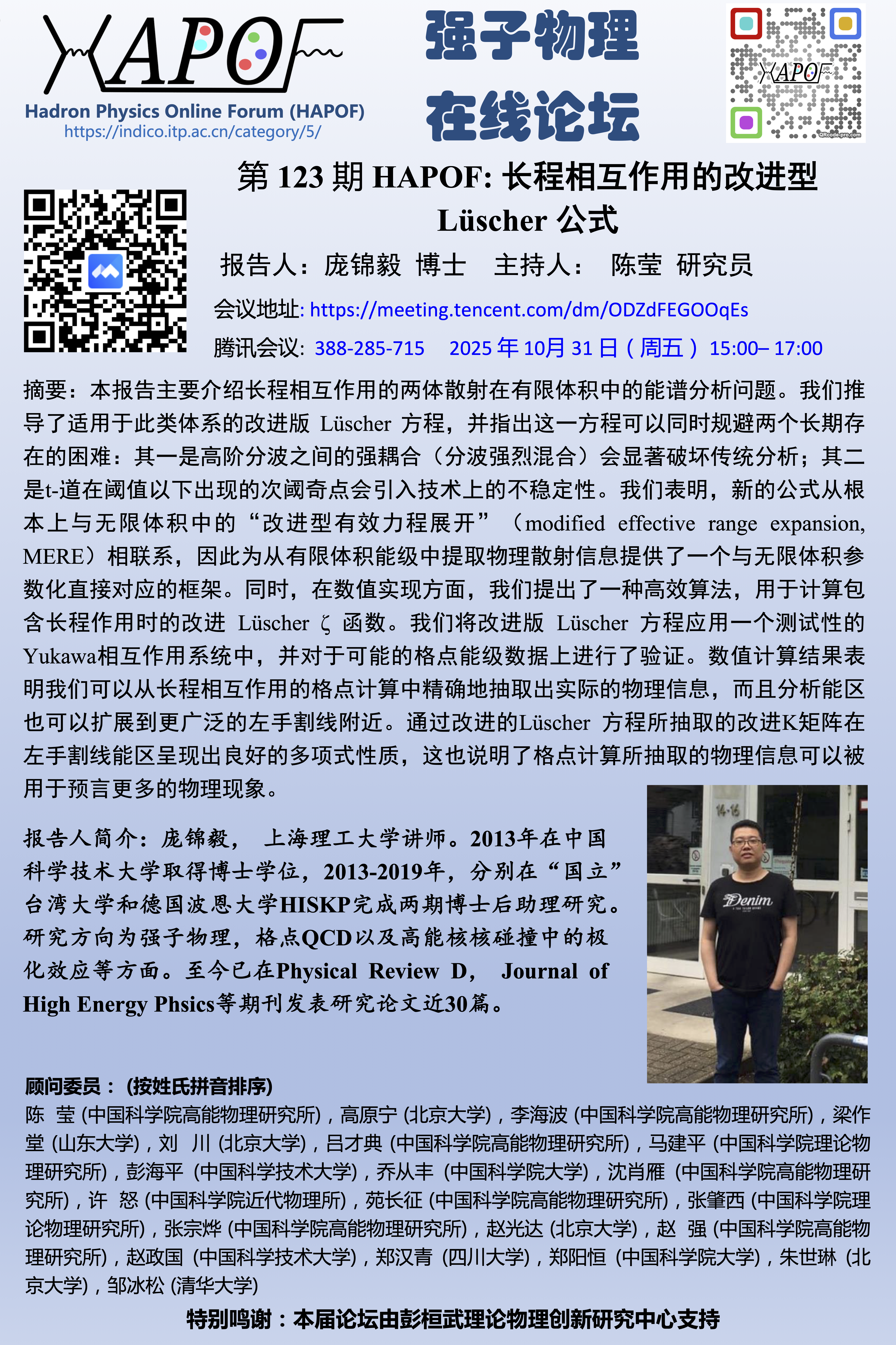 第一百二十三期HAPOF,长程相互作用的改进型Lüscher 公式,庞锦毅 博士,2025年10月31日