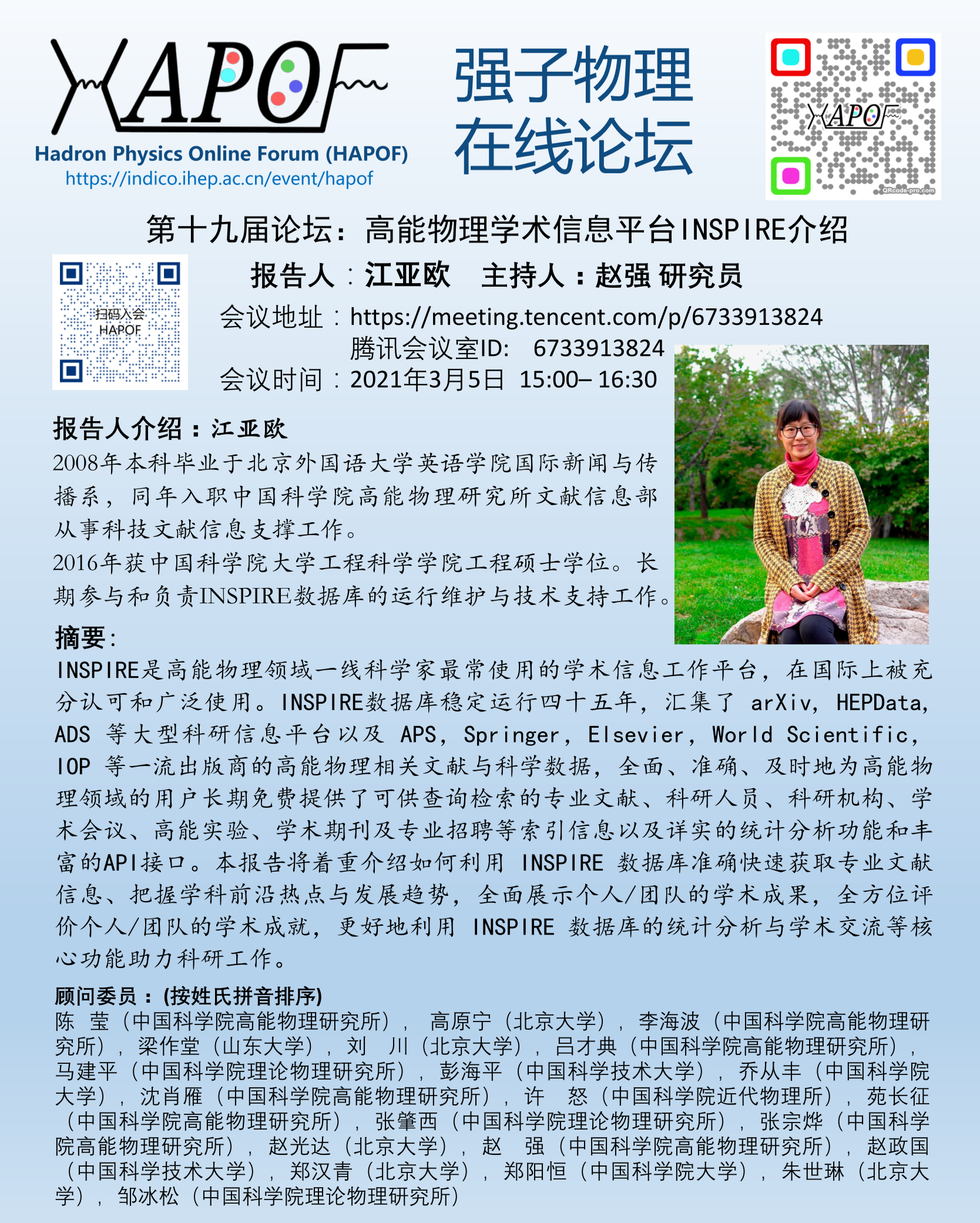 第十九届HAPOF论坛,高能物理学术信息平台INSPIRE介绍,江亚欧,2021年3月5日