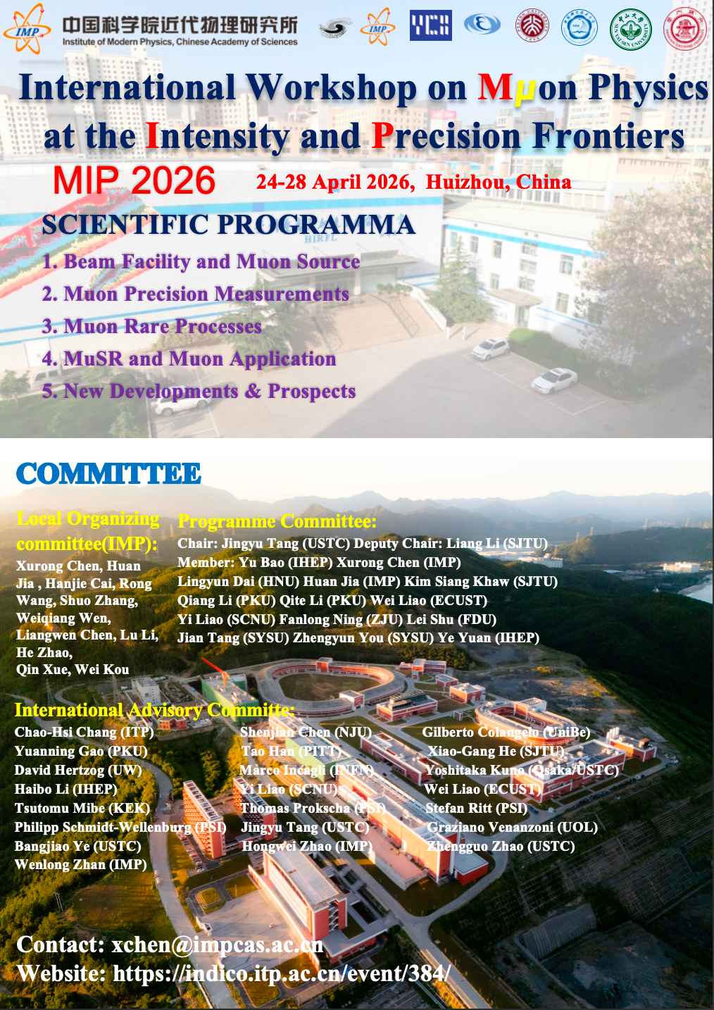 The MIP 2026 workshop (registration opens on April 24, scientific program runs April 25-27) is jointly organized by the Particle Accelerator Branch of the Chinese Physical Society / Chinese Nuclear Society and the Institute of Modern Physics, Chinese Academy of Sciences, which also serves as the host. This event is jointly supported by the Southern Center for Nuclear Science Theory and other institutions.