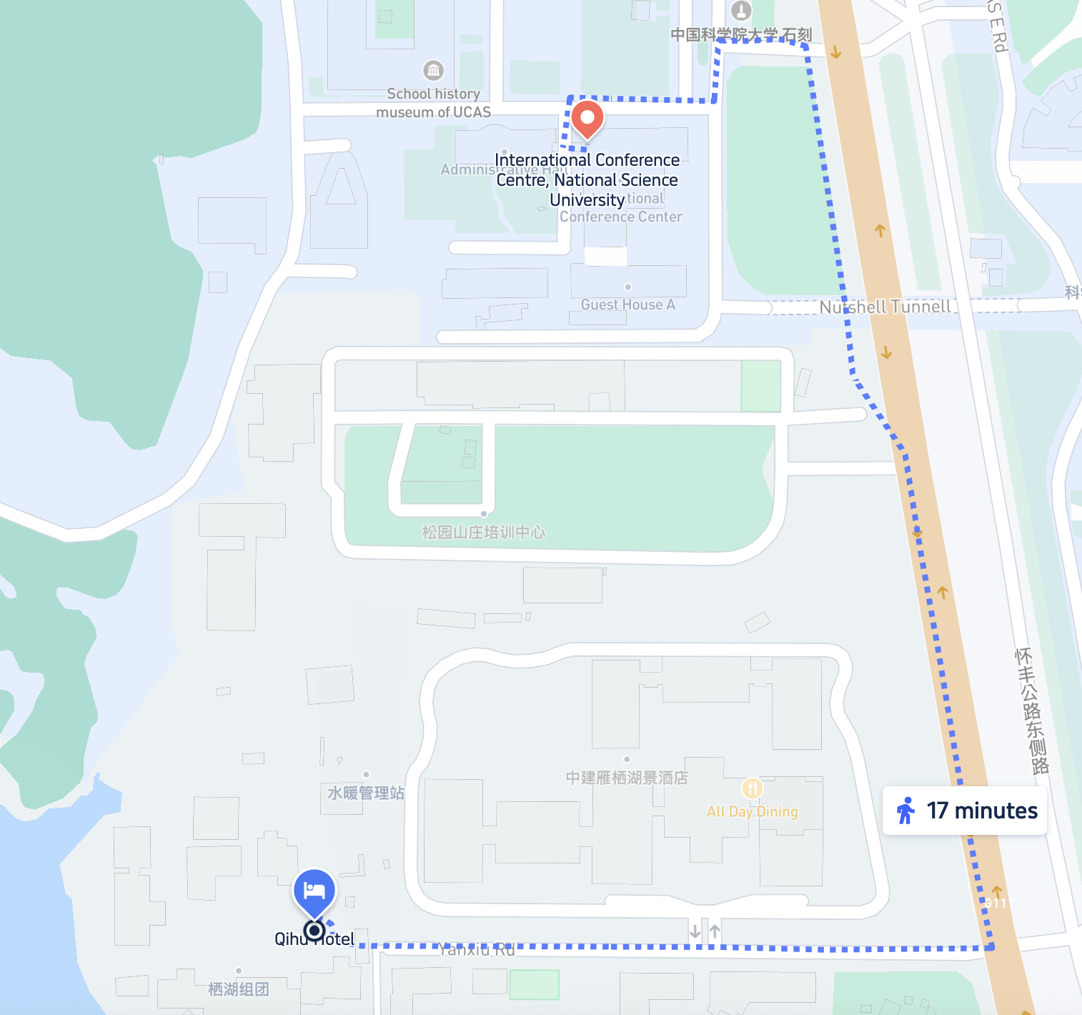 Please note that the conference venue and the conference hotel are in different locations within the Yanqi Lake area. The conference will be held at the International Conference Center, and accommodation will be provided at Qihu Hotel. The hotel is approximately a 17-minute walk from the conference venue. A map of the walking route is provided below.