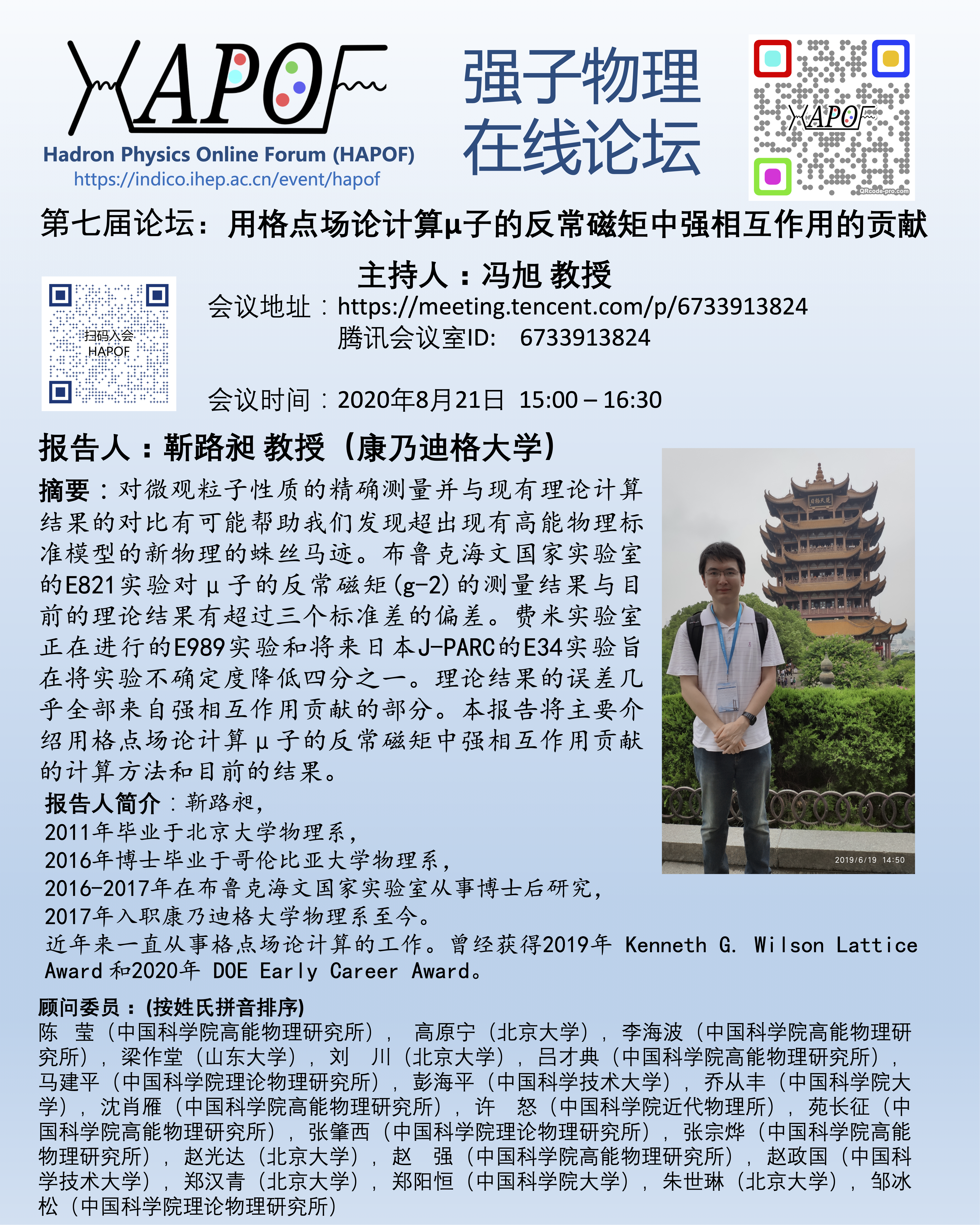 第七届HAPOF论坛,用格点场论计算μ子的反常磁矩中强相互作用的贡献,靳路昶 教授,2020年08月21日