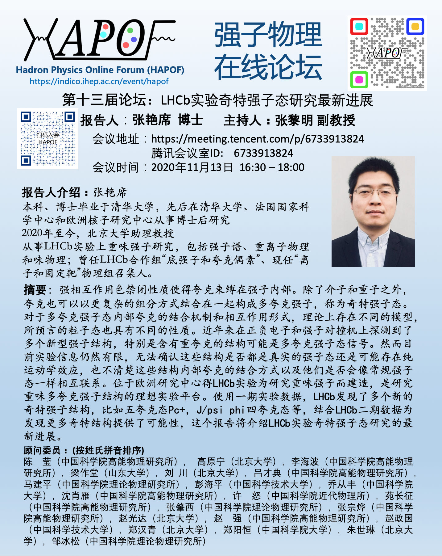 第十三届HAPOF论坛,LHCb实验奇特强子态研究最新进展,张艳席 博士,2020年11月13日