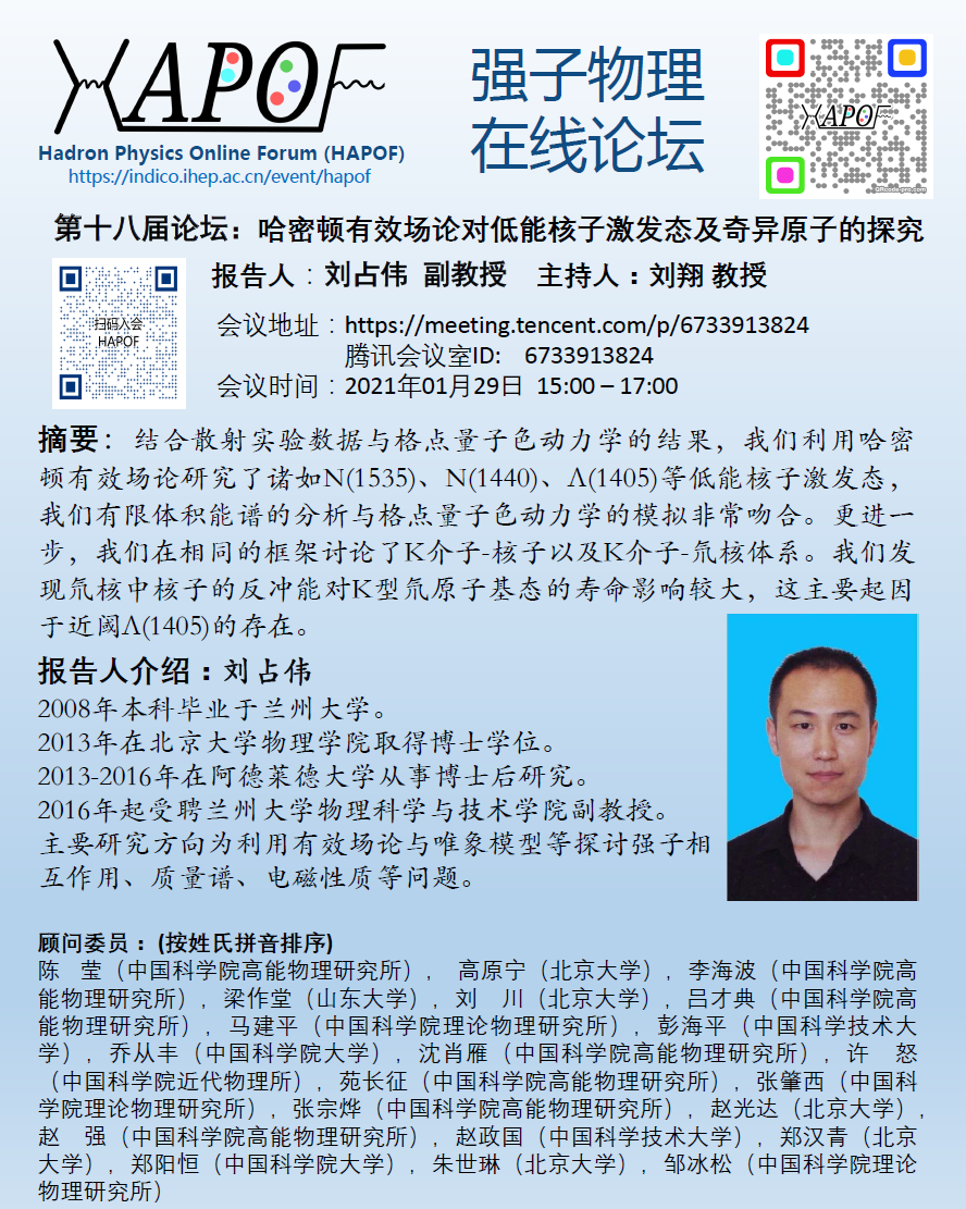 第十八届HAPOF论坛,哈密顿有效场论对低能核子激发态及奇异原子的探究,刘占伟 副教授,2021年01月29日